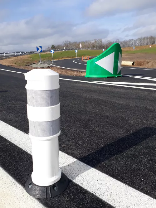 En complément du guidage que constitue le marquage au sol, le balisage permet de renforcer la bonne lecture des trajectoires pour que les conducteurs puissent ajuster au mieux leur comportement. Les balises d’alignement J1 sont particulièrement adaptées aux zones rurales et sur routes départementales. En cas de virages serrés, l’alerte peut être renforcée par la pose de balises J4 représentant des chevrons directionnels, et dont la taille sera fonction du type et de la configuration de la voie.